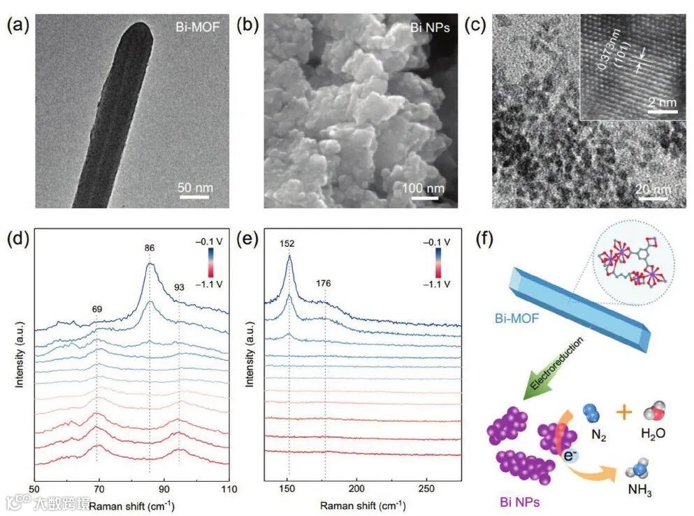 图1显示了棒状Bi-MOF原位电化学还原形成Bi NPs的这一转变过程。电子显微镜照片发现棒状的Bi-MOF在还原后结构坍塌,形成紧密堆积的Bi0纳米颗粒。拉曼光谱发现,电位从−0.1 V ~ −0.3 V过程中,MOF的特征峰(86 cm-1和152 cm-1)逐渐减弱,当电位比−0.5 V更负时,Bi-Bi振动(69 cm-1和93 cm-1)逐渐增强。这说明当电位低于−0.5 V 时(实际NRR反应的电位区间),Bi主要是以零价Bi0 存在。