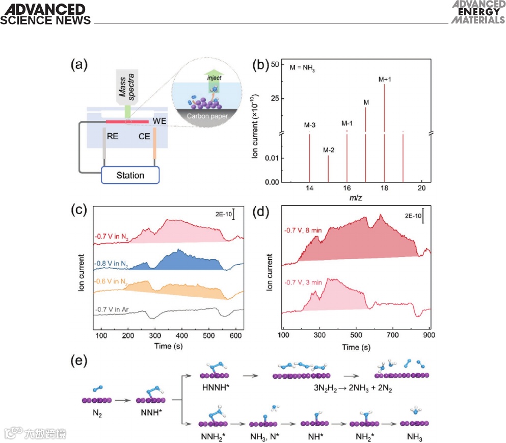 图4:在线微分电化学质谱检测NRR过程中挥发性中间体和产物。