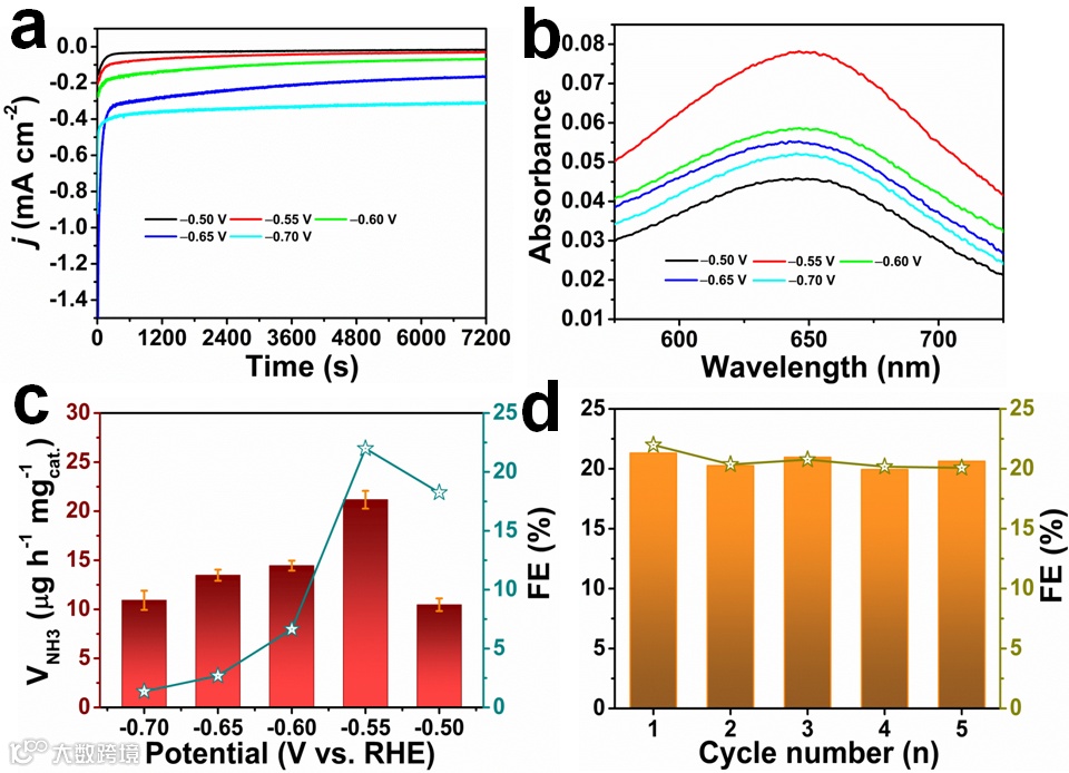 NRR电化学测试结果发现,在0.5 M LiClO4溶液中,该催化剂在-0.55 V (相对于可逆氢电极) 下可获得21.31 μg h–1 mg–1cat.的NH3产率和21.99%的法拉第效率,优于许多已报道的电化学合成氨Ti基催化剂。