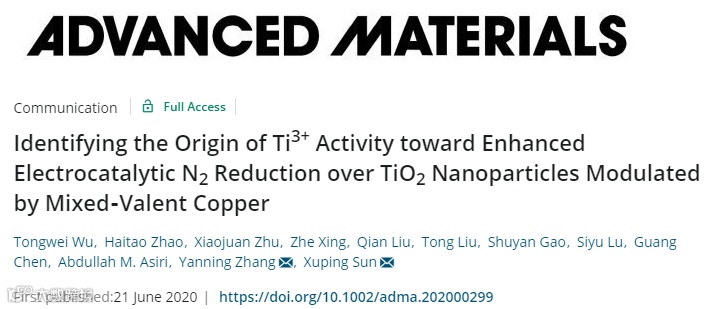 近年来,纳米TiO2材料已经被广泛用于氮气还原电催化剂。基于此,电子科技大学基础与前沿研究院的孙旭平和张妍宁教授等人在国际知名期刊Advanced Materials上发表题为“Identifying the Origin of Ti3+ Activity toward Enhanced Electrocatalytic N2 Reduction over TiO2 Nanoparticle Modulated by Mixed-Valent Copper”的文章。