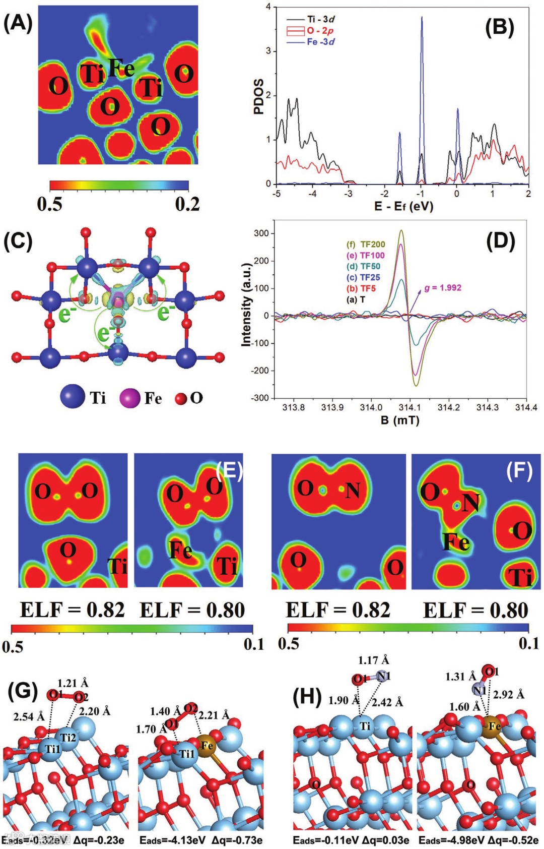 Figure 3. A). The electronic local function, B) projected density of states, C) charge difference distribution of single atomic Fe doped TiO2 (charge accumulation in blue and charge depletion in yellow), D) EPR spectra of the prepared TiO2-HMSs, the Electronic Local Function of E) O2, and F) NO in TiO2-HMSs before and after anchored with single atomic Fe, together with the corresponding structure optimization models after adsorption of G) O2 and H) NO, respectively.