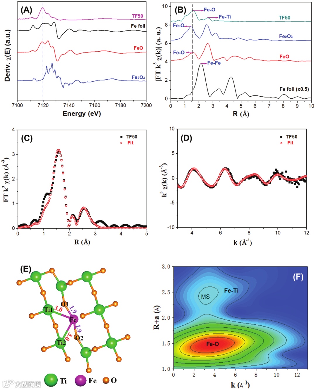 Figure 2. A) Comparison of Fe k-edge XANES spectra and B) corresponding Fourier transform spectra of Fe foil, FeO, Fe2O3, and TF50 samples, C) EXAFS r space-fitting curves and D) K space-fitting curves of TF50 sample, E) local atomic structure around Fe and F) WT of TF50 samples.