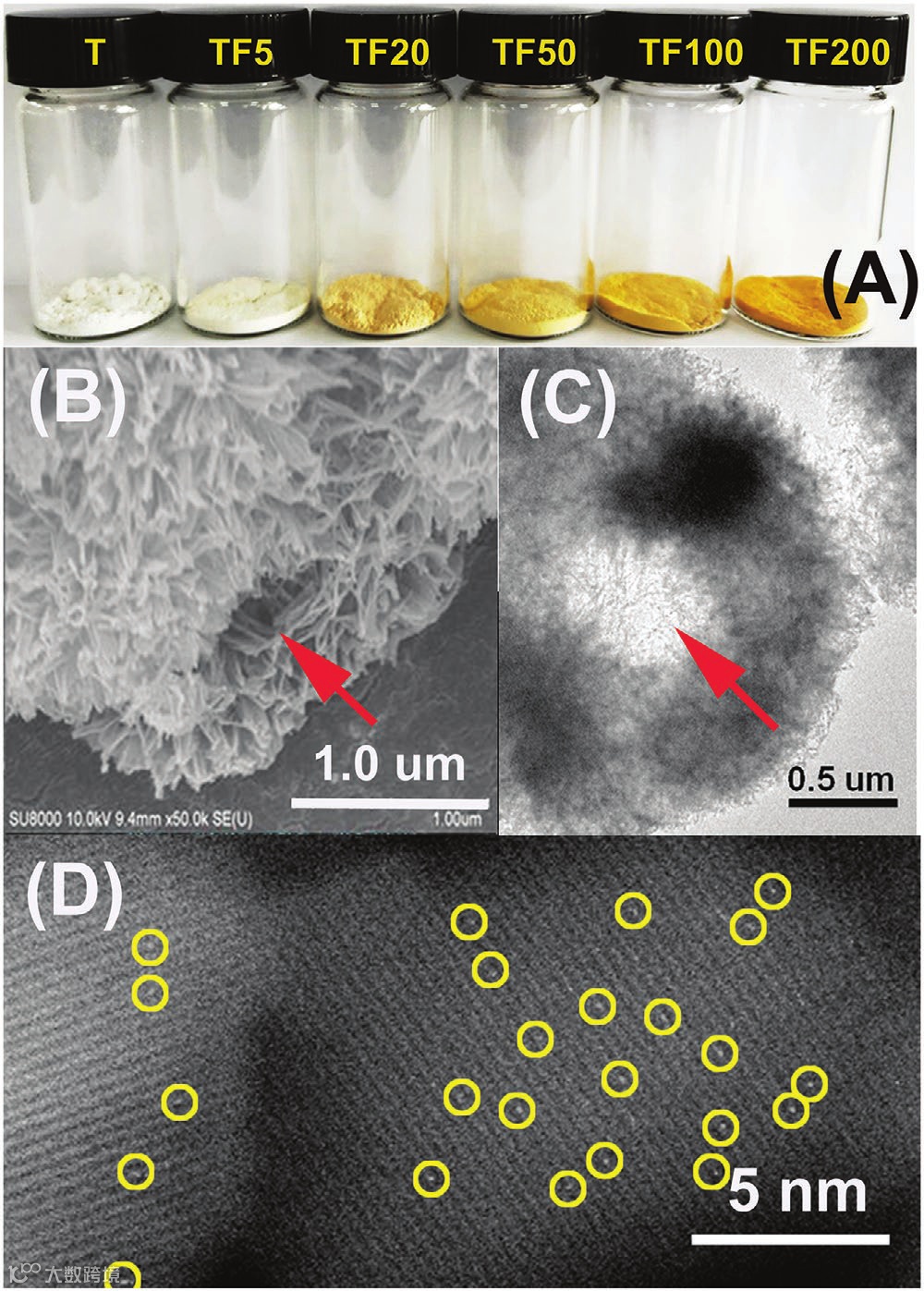 Figure 1. A) Optical image of the prepared TiO2-HMSs photocatalysts, B) SEM, C) TEM, and D) HAADF-STEM images of Fe1/TiO2-HMSs (TF50) sample (Red arrows indicate the hollow interiors of TiO2-HMSs, and the Fe positions are indicated by orange circles).