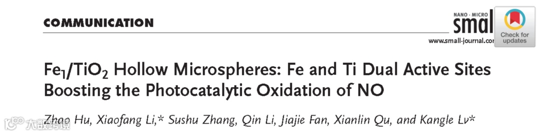 近日,来自武汉科技大学的黎小芳博士与中南民族大学的吕康乐教授合作,在国际知名期刊Small(影响因子:11.459)上发表题为“Fe1/TiO2 Hollow Microspheres: Fe and Ti Dual Active Sites Boosting the Photocatalytic Oxidation of NO”的研究快报。