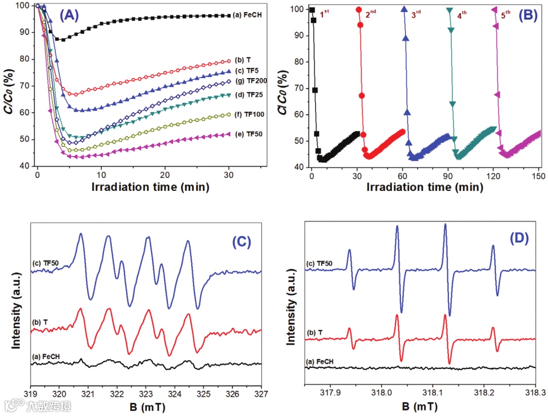 Fe-Ti双活性位点的协同作用,显著促进了NO的光催化氧化,且表现出优良的光催化稳定性能(图4)。单原子铁修饰通过增强光吸收和促进载流子分离,而大大增强体系产生活性氧自由基的能力。