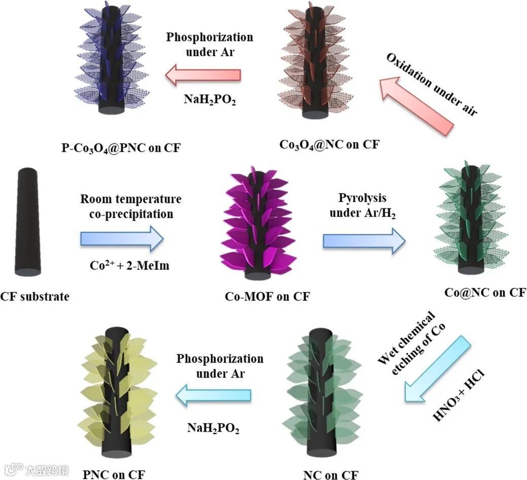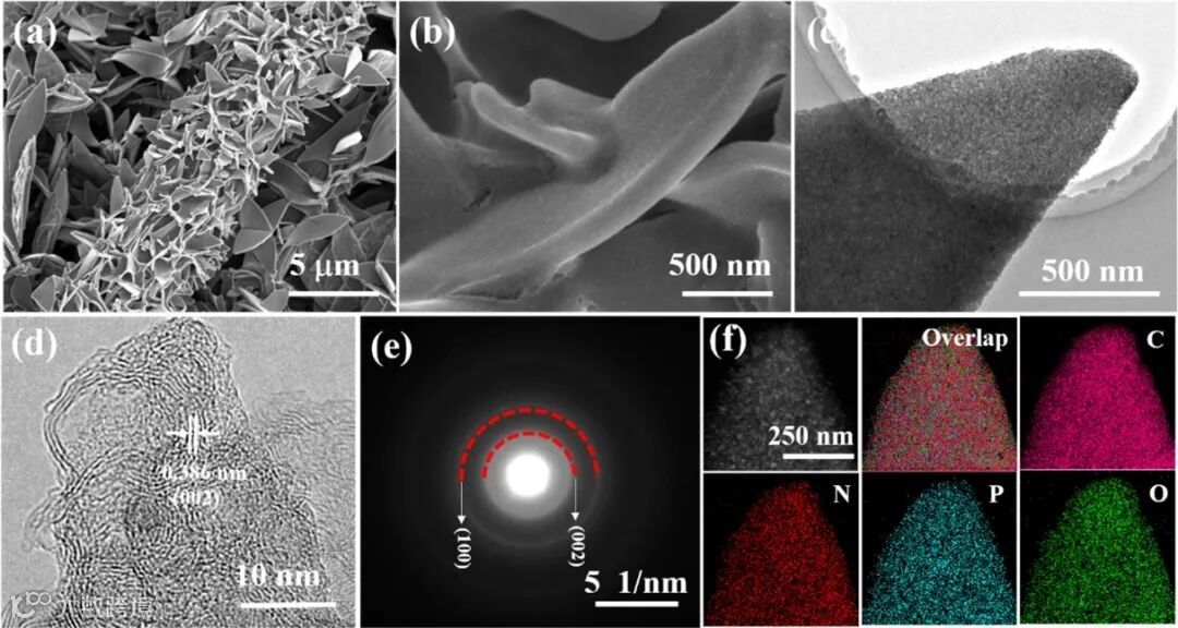 该工作采用表面修饰和控制结构策略制备了以金属有机骨架(MOF)为模板的杂化纳米片,其中原位掺杂磷的Co3O4纳米粒子均匀地包裹在导电的P–N共掺杂碳基质中(表示为P-Co3O4@PNC)。这种混合结构具有较短的离子扩散距离,较大的表面/体积比,以及丰富的活性位点和结构缺陷特征。因P-Co3O4和PNC间的强烈协同作用以及电化学活性中心/界面的高可用性,确保了电荷/传质的快速动力学反应从而实现优越的电荷储存能力。