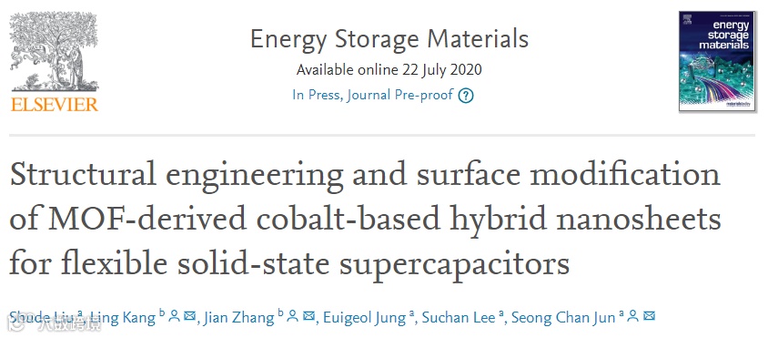 近日,延世大学Seong Chan Jun教授、华东师范大学张健教授课题组在国际顶级期刊Energy Storage Materials (影响因子:16.8) 上发表题为“Structural engineering and surface modification of MOF-derived cobalt-based hybrid nanosheets for flexible solid-state supercapacitors”的研究工作。