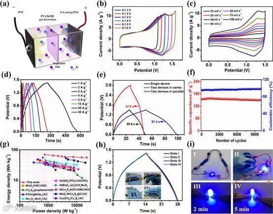 图6. P–Co3O4 @ PNC // PNC ASC器件示意图及电化学性质。