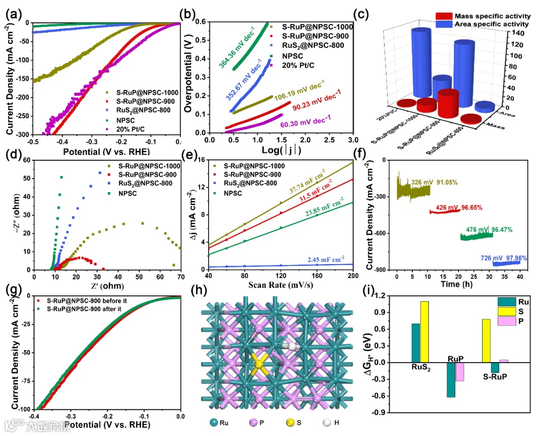 图4显示制备的S-RuP@NPSC-900电催化剂在Ru负载量仅为0.8wt%的条件下获得媲美20%商业Pt/C的产氢性能(450 mV 过电位下,S-RuP@NPSC-900电流密度为320.09 mA cm−2 超过 20% Pt/C 310.34 mA cm−2)。