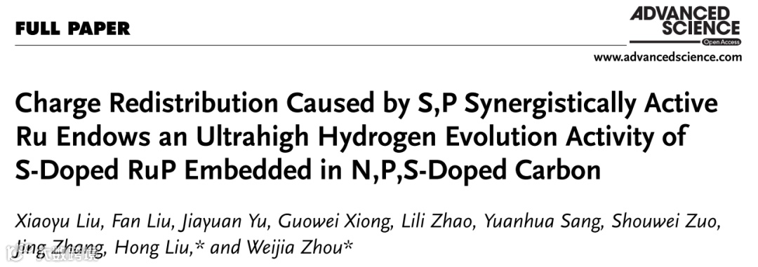 该文章“Charge Redistribution Caused by S,P Synergistically Active Ru Endows an Ultrahigh Hydrogen Evolution Activity of S-Doped RuP Embedded in N,P,S-Doped Carbon”发表在国际知名期刊Advanced Science(影响因子:15.84)。