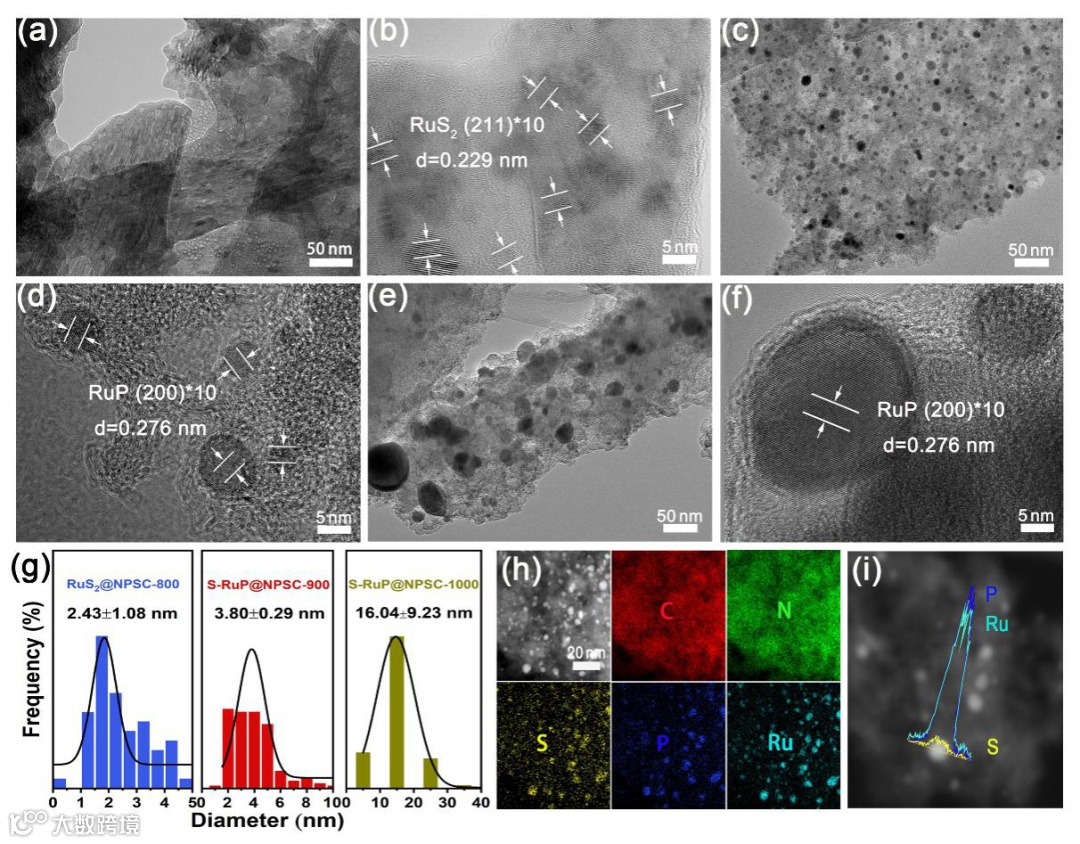 图2对比了不同温度下合成的样品的尺寸以及晶格,可以发现,随着温度的升高,纳米颗粒物相逐渐由RuS2转化为S-RuP,颗粒尺寸逐渐增大。从元素分布可以看出N元素主要掺杂在基底碳中,不与Ru成键,主要为S和P与Ru成键,同时温度升高Ru更易与P成键形成RuP, S以掺杂形式存在。