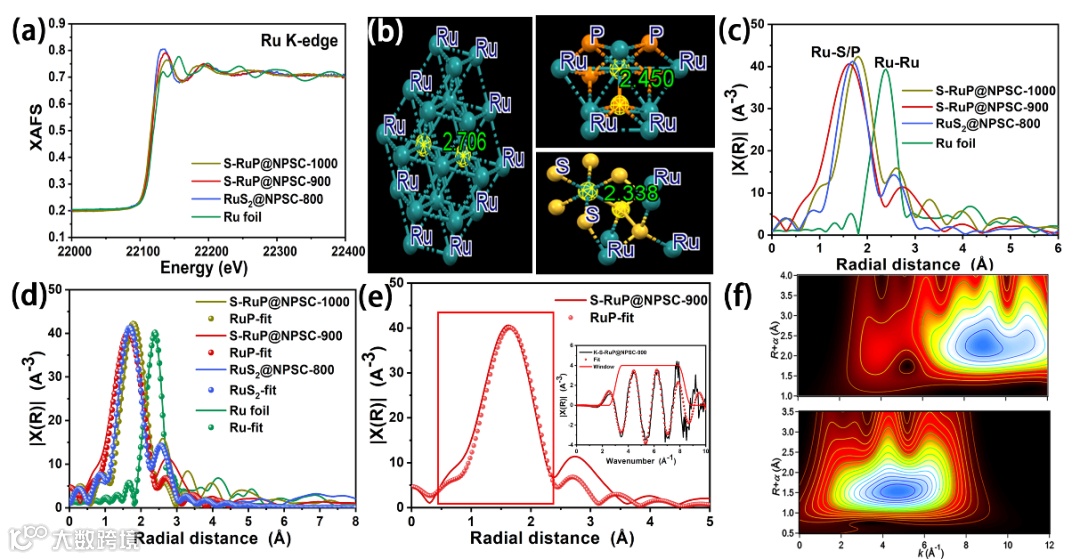 图3显示了K近边位置合成的钌样品较Ru金属氧化态降低(a),不同温度合成的样品的配位主要为Ru-S或者Ru-P,明显区别于Ru金属中的Ru-Ru(c)基于EXAFS拟合和WT-EXAFS。