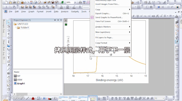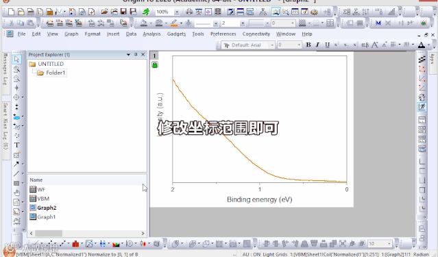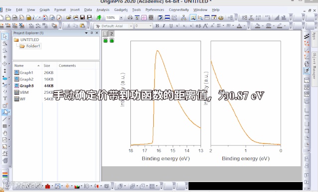 在Origin中找到价带距离功函数的位置,这里需要手动微调,个人主观性比较大,但必须考虑材料的带隙,不能超过带隙的大小,也需要考虑材料的属性,是p型或者是n型半导体,如果这些弄错就是严重的错误了。