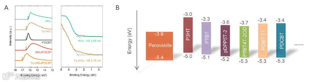 如下图1是2016年的一篇Science文章UPS图[1],核心思路很简单:打开OPV的材料库,从里面找一种能级更匹配、界面接触更好、稳定性更好的空穴传输层材料,用于钙钛矿体电池。所以一个学科的发展,可能是其它学科的肩膀。UPS原理就是爱因斯坦那极具想像力与说服力的光电效应方程(Ek=hν-W0),但当时却遭遇到学术界强烈的抗拒,说明每一代科学家中都有固执的人。本文介绍这篇Science文章UPS的数据处理方法,并强调制样的注意事项。