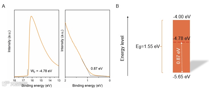 下面图2就是最后得到的效果图,假设该材料的带隙为1.55 eV(这可以通过吸收图获得),那么其能级位置如图2B所示:功函数为-4.78 eV,价带位置距离功函数为0.87 eV,也就是-5.65 eV,价带值加上光学带隙1.55 eV,就是导带位置-4.00 eV。