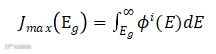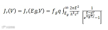 考虑到这些因素,Shockley和Queisser于1961年首先预测了单结太阳能电池的效率极限(S–Q极限),发现带隙为1.1 eV的半导体的最大效率为30%。 根据最近基于SQ细致平衡模型的计算,可以根据以下公式计算最大光电流密度Jmax: