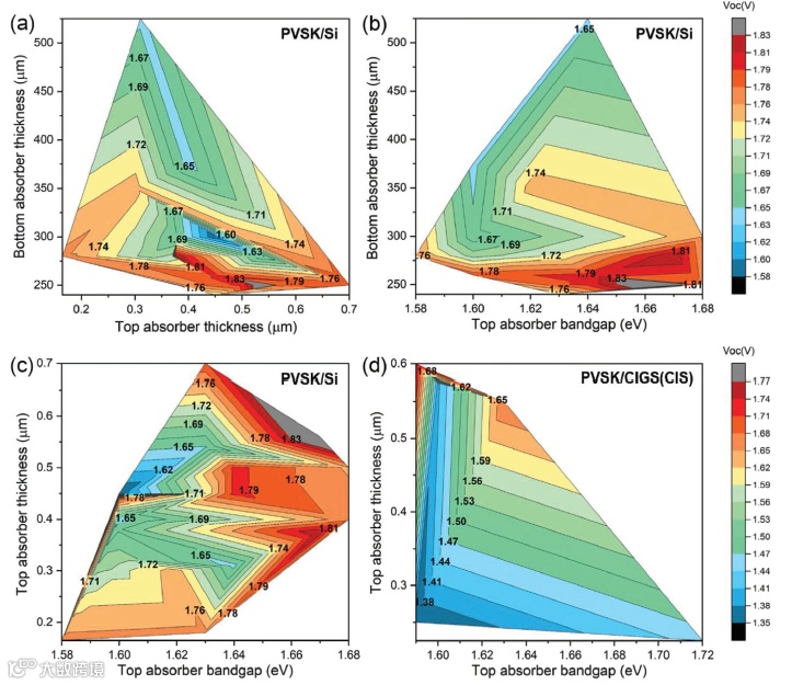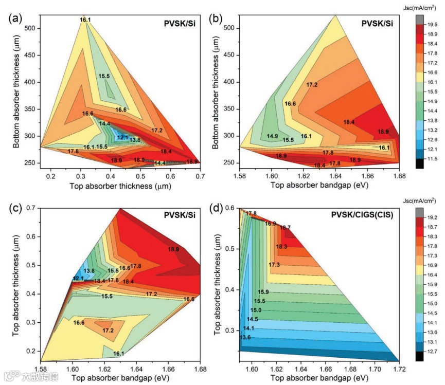 为了掌握两端型钙钛矿基叠层器件的最新发展概况,并找到真实(而非理论)器件参数之间的一般关系,本文对目前为止几乎所有2T钙钛矿基叠层电池的数据进行了数据相关性可视化处理。在假设所有叠层电池的底部吸收层(Si或CIGS)具有相同的带隙(≈1.2eV)的前提下,本文对Jsc,Voc,吸收层厚度(顶部/底部子电池)和带隙值之间的关系进行了可视化作图(图5,图6)。