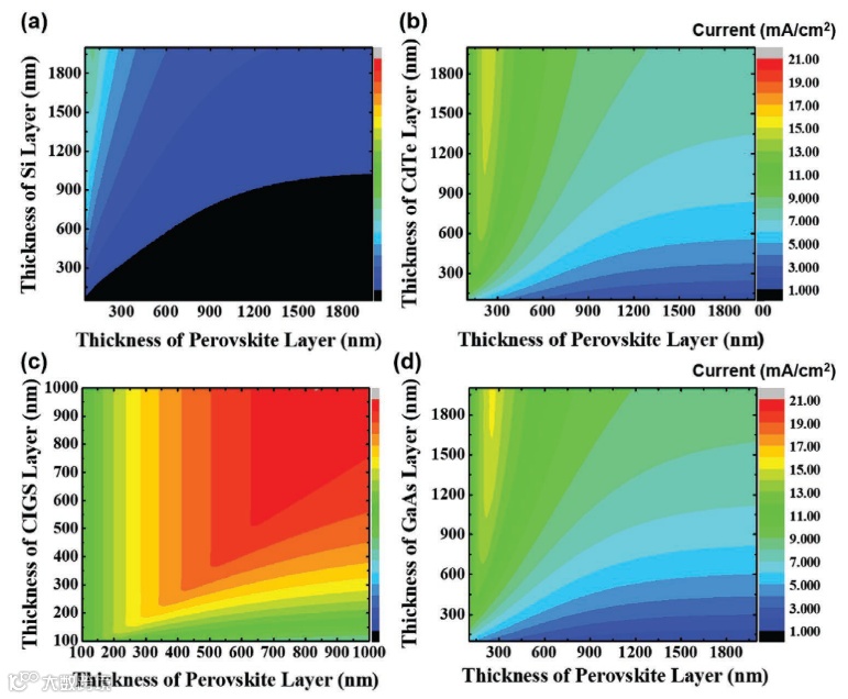 柔性电子的概念可以拓宽钙钛矿基叠层电池的市场,而太阳能模块的总厚度对于满足特定情况下的变形要求至关重要。通常,对于顶部子电池,应优化厚度以便可以吸收尽可能多的短波长入射光,并可以使足够的长波长光穿透以到达底部子电池,同时底部子电池应尽可能地捕获穿透过来的光子能量。但是出于柔性的考虑,吸收层厚度应在折叠能力和吸光度之间取得最佳平衡点。为了寻找吸收层厚度的最佳组合,在假设所有吸收的光子都被转换成光电流而没有任何电荷复合的前提下,本文对四种不同的钙钛矿基叠层电池(钙钛矿/ c-Si,钙钛矿/ CdTe,钙钛矿/ CIGS和钙钛矿/ GaAs)的理想Jsc与吸收层厚度的关系进行了初步的理论计算。