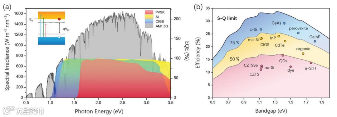 然而,太阳能电池的效率受到热力学第二定律和肖克利-奎伊瑟极限的限制,作为太阳能电池吸收层的半导体材料只能吸收能量高于其带隙的光子,并且由于电荷载流子的热平衡机理,这些吸收的光子能量并不能完全转换为电势差 (图1a);其次,热力学定律决定了太阳能电池会产生自发辐射,造成载流子辐射复合并导致电压损失;第三,最大电源电压 (Vmp) 和最大电流密度 (Jmp) 始终分别低于开路电压 (Voc) 和短路电流密度 (Jsc)。