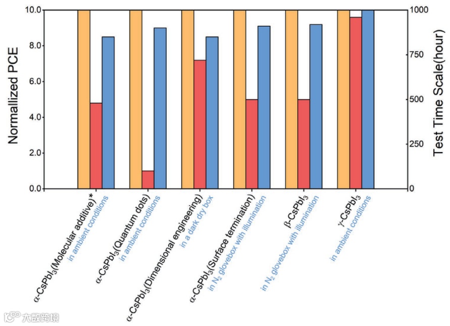 将Cs掺入杂化钙钛矿的有机阳离子中可以显着改善钙钛矿器件的光和热稳定性,也就是说,不稳定的有机阳离子的存在阻碍了这些材料保持长期稳定性。 因此,实现更好的材料和器件稳定性的有效方法之一是用无机阳离子(例如Cs +)完全替代这些有机阳离子。