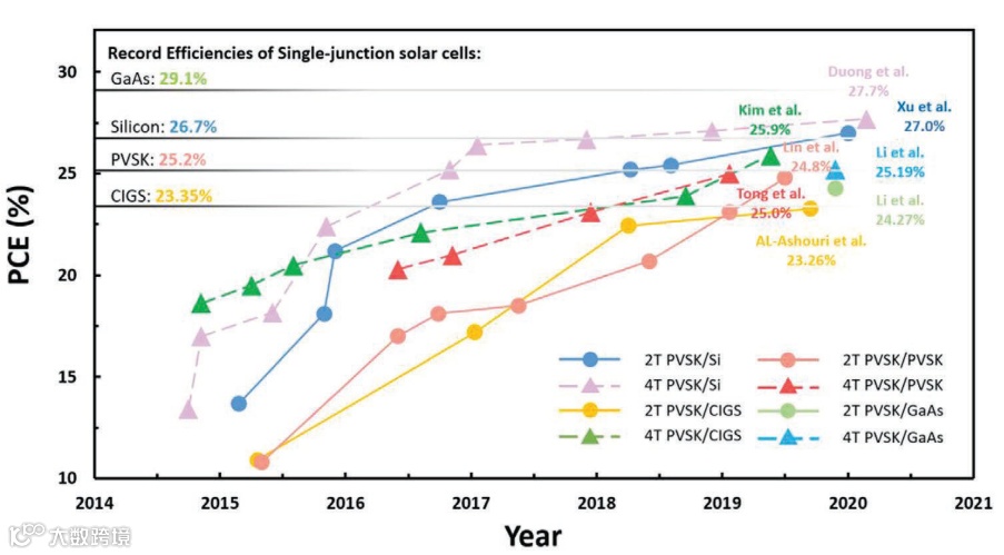 由于晶硅太阳能电池与CIGS太阳能电池在实验室与工业中已具备成熟的工艺,因此钙钛矿/晶硅与钙钛矿/CIGS叠层器件的相关报道较多,并且也已经实现了较高的光电转化效率。