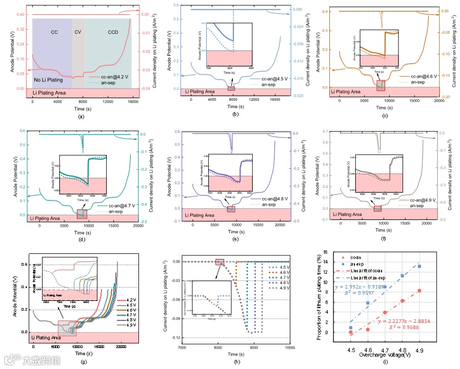 (g)–(h): 各个电压下负极-隔膜界面的负极电位(g)和析锂电流密度(h) ((a)–(f)的总结);