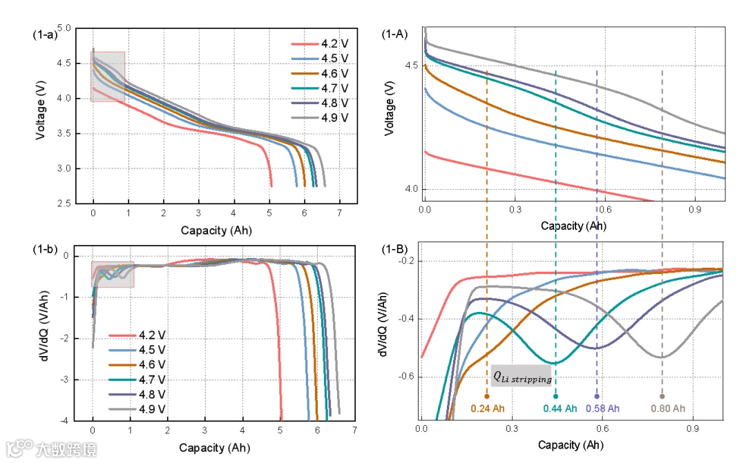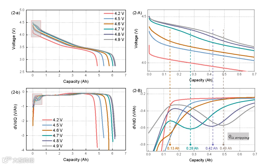 图 1展示了在0.2 C和0.5 C放电4.2 V,4.5-4.9V下,电压与容量的关系、差分电压和差分容量的结果。以0.5 C为例进行分析:从图 1(2-a/A)中可以看出,4.7 V,4.8 V和4.9 V三个过充截止电压下在放电初期出现了一段高电压平台,我们认为是锂溶解电压平台,对放电曲线进行差分电压和差分容量,如果二者出现极小值,则说明发生析锂。