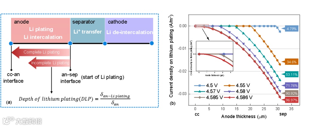 (a):“完全析锂”和“不完全析锂”图解,以及析锂深度(DLP)的定义;(b):0.5C时负极厚度方向的析锂电流密度以表征不完全析锂的电压区间,以及计算的DLP。