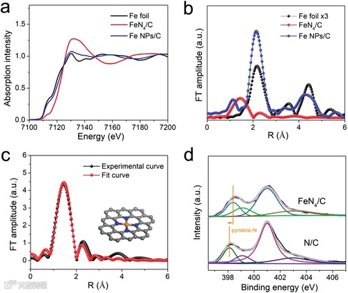 a) Fe K‐edge XANES spectra of Fe foil, FeN4/C, and Fe NPs/C. b) FT of the Fe K‐edge EXAFS oscillations of Fe foil, FeN4/C, and Fe NPs/C. c) EXAFS fitting curve for FeN4/C. Inset is the schematic model of FeN4 structure, with Fe in orange, N in blue, and C in gray. d) N 1s XPS spectra of FeN4/C and N/C.