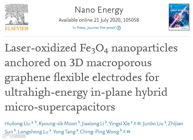 近日,佐治亚理工学院汪正平院士、华南理工大学谢颖熙副教授在国际顶级期刊Nano Energy (影响因子:16.602) 上发表题为“Laser-oxidized Fe3O4 nanoparticles anchored on 3D macroporous graphene flexible electrodes for ultrahigh-energy in-plane hybrid micro-supercapacitors”的研究工作。