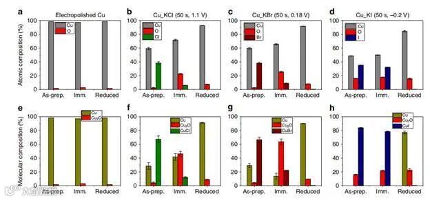 当样品浸入饱和0.1μM KHCO3的空气中10分钟时,Cu_KCl和Cu_KBr的初始表面物种通过氧化物形成反应转化为Cu2O(图4f,g)。