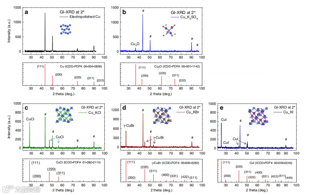 图2. 通过掠入射X射线衍射鉴定出卤化Cu的晶体结构。