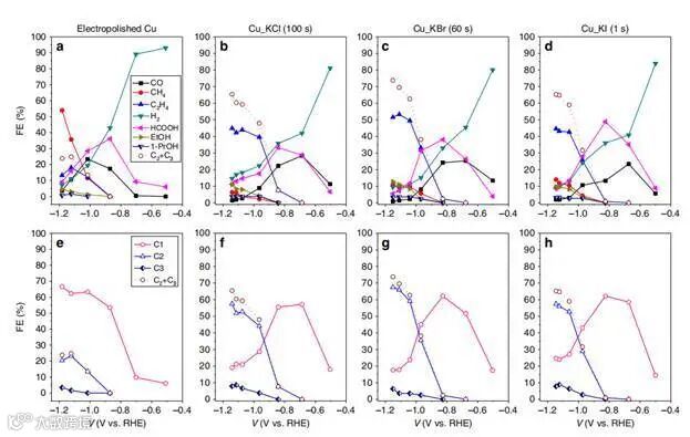 在Cu(I)-卤化物衍生催化剂上获得的主要产物是C2H4,在~−1.15 V vs. RHE条件下,其FE最高(Cu KCl为45.1%,Cu KBr为49.5%,Cu KI为44.5%)。