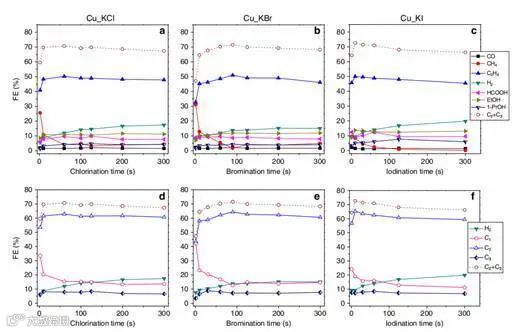 当卤化反应时间增加到300 s时,三种铜(I)-卤化物衍生催化剂上H2的FE显著增加。为了使竞争的HER反应最小化,为每种Cu_KX催化剂寻找最佳卤化时间。用60 s的阳极氯化时间,制备了FEC2H4为50.2%和FEC2+为70.7%的Cu_KCl催化剂,用90 s的阳极溴化时间制备了FEC2H4为50.9%和FEC2+为71.5%的Cu KBr催化剂,用10 s的阳极碘化时间制备了生成FEC2H4为50.0%和FEC2+为72.6%的Cu_KI催化剂