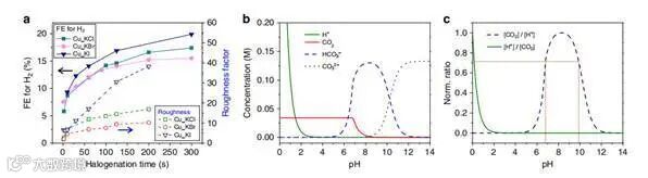 图7a显示了催化剂的粗糙度,H2的FE和卤化时间之间的关系。粗糙度与HER之间的相关性可以通过在高局部pH值下催化剂表面附近溶解的CO2与质子的浓度比([CO2]/[H+])降低来解释。