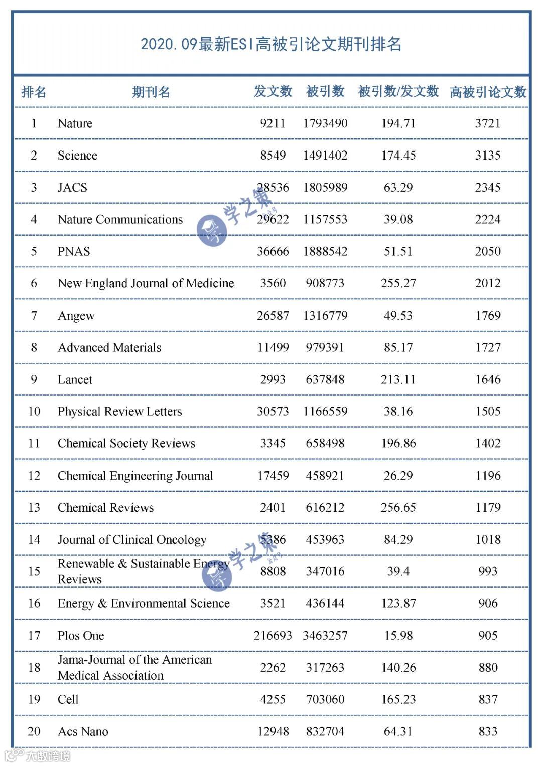 本期我们整理了2020年9月最新公布的高被引期刊排名TOP100(本文以高被引论文数排名,有的地方也以被引数排名)。从下表可以看出,Nature和Science这两大王牌期刊毫无疑问占据了第一、二位,排名第三的是化学领域的百年王者JACS。