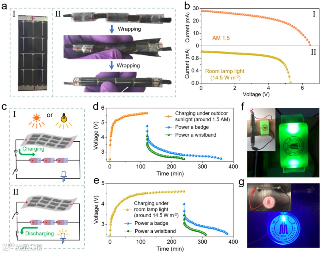 将该准固态锌锰电池与柔性非晶硅太阳能薄膜相结合,首次集成制得一种新型“自供电能量棒”。该自供电能量棒可以在室外/室内不同的光照强度下高效实现能量的收集和储存,并成功驱动可穿戴电子设备(手表和徽章)。