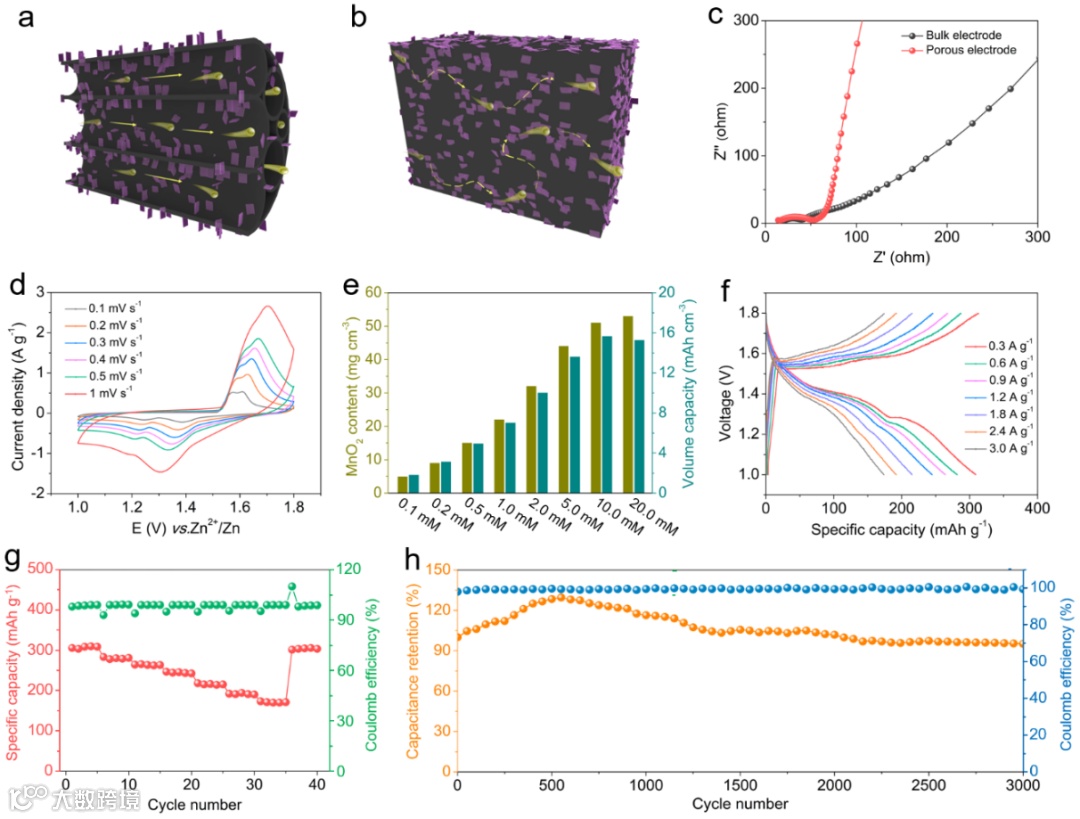 测试结果表明,电极材料内部的多级开放通道结构,有利于电解质扩散和离子转移,使得该电极材料同时实现了电化学活性物质的高负载(51 mg/cm3)和高容量(306.7 mAh/g或15.1 mAh/cm3),以及良好的倍率性能(电流密度增大10倍,容量保持56.34%)和优异的循环稳定性(3000次循环充放电后仍能保持95.2%的容量)。