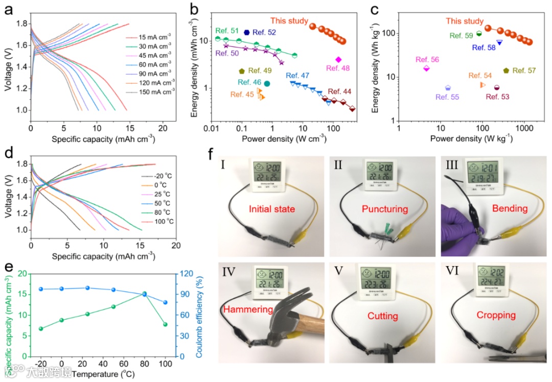 采用PVA/LiCl-ZnCl2-MnSO4凝胶作为电解质组装的COG@MnO2//COG@Zn准固态电池,能量密度高达20.5 mWh/cm3或420.1 Wh/kg,而且可以在非常宽的温度范围(-20~100℃)内安全工作,甚至受到一系列人为破坏(如穿刺、弯曲、锤击、切割和剪切)后,电池依然可以正常工作,表现出非常优秀的安全性能。