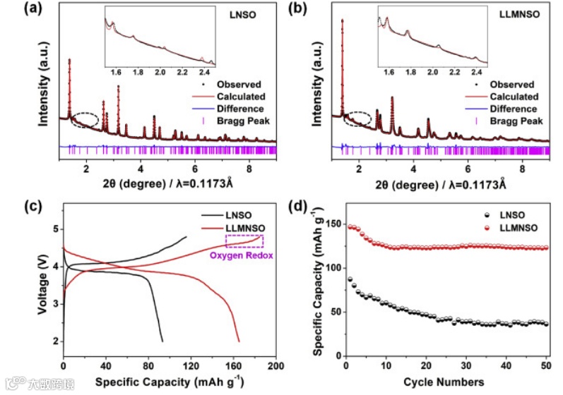 与以前报道的富锂层状氧化物不同,LLMNSO表现出高的初始容量(是LNSO的两倍),初始库仑效率高达90%左右,并且循环稳定性极佳。这些发现为通过调节局部氧气环境在LIB中设计具有更高能量密度和更好循环稳定性的新正极提供了指导。