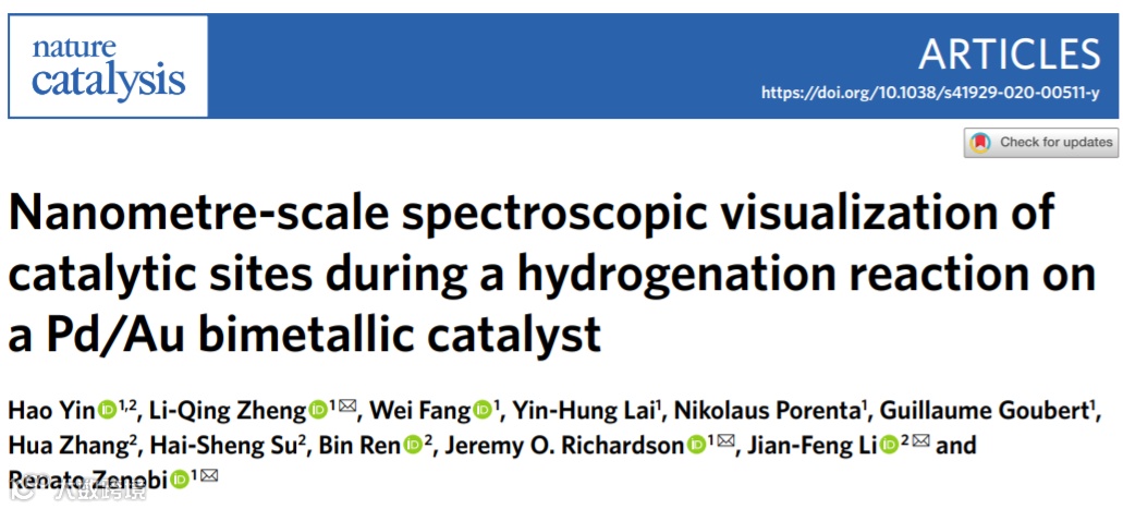 近日,苏黎世联邦理工学院Renato Zenobi教授,Jeremy O. Richardson教授,郑丽清博士和厦门大学李剑锋教授合作在国际顶级期刊Nature Catalysis (影响因子:30.471) 上发表题为“Nanometre-scale spectroscopic visualization of catalytic sites during a hydrogenation reaction on a Pd/Au bimetallic catalyst”的研究工作。