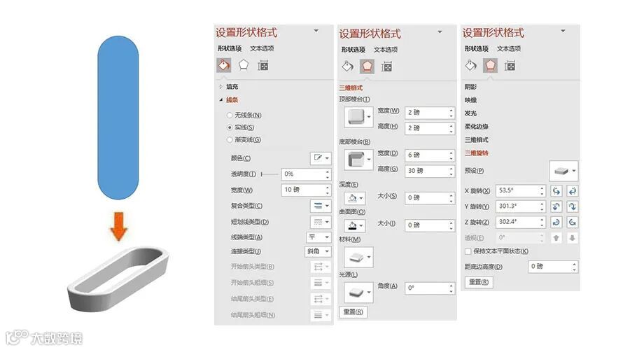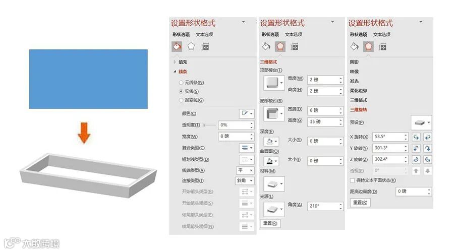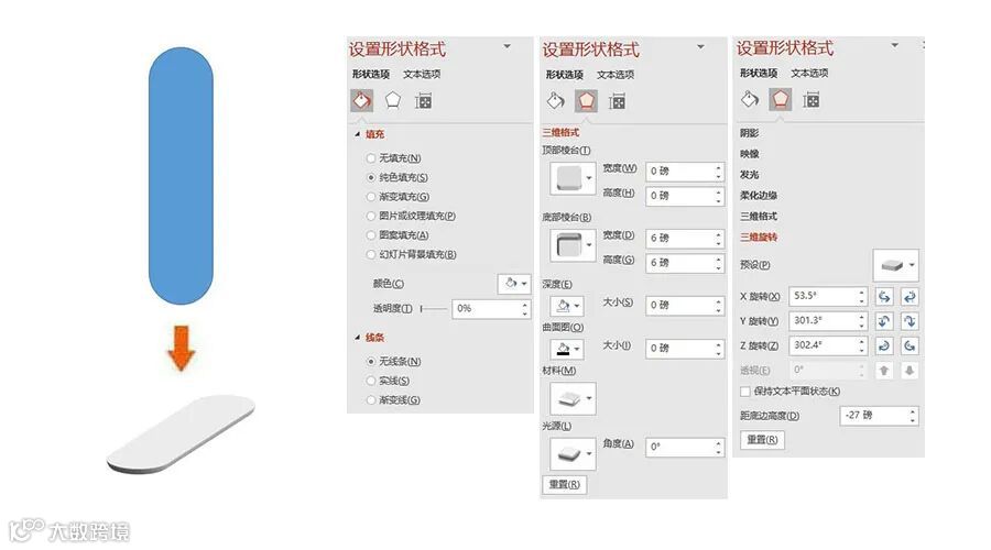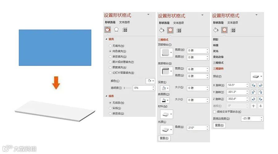 三维旋转:X旋转-53.5°,Y旋转-301.3°,Z旋转-302.4°,距底边高度-0磅。