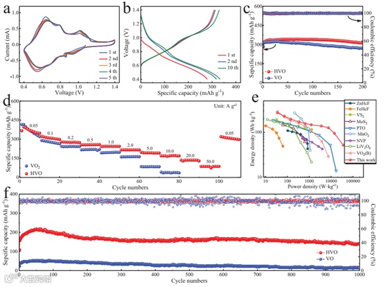在本研究中,结晶水和缺陷同时引入到VO2隧道结构中。晶格缺陷打破了离子与宿主结构之间的强静电相互作用,提供了快速的离子扩散途径。结晶水通过减少与周围框架的相互作用,起到稳定通道结构和提高电荷屏蔽效应的作用。基于HVO电极独特的结构特点, 在低成本ZnSO4电解液中它表现出了高可逆放电容量(396 mAh g-1,0.05 A g-1),理想的倍率性能 (88 mAh g-1,50A g-1),和良好的循环稳定性(10 A g-1下1000次循环后容量保留率达90%)。通过XRD、SEM和密度泛函理论对反应机理进行了研究,结果表明,这种优良的倍率性能是由插层赝电容行为决定的。该反应策略适用于未来水系锌离子电池的设计与发展。