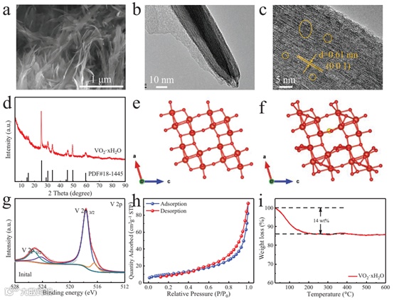 弱范德华相互作用使离子插层型宿主成为理想的储能赝容性材料。近日,哈尔滨工业大学张乃庆与孙克宁老师团队在Adv. Mater.期刊上发表了题为“Intercalation Pseudocapacitive Zn2+ Storage with Hydrated Vanadium Dioxide toward Ultrahigh Rate Performance”的研究论文,本文提出了一种具有良好输运通道的水合二氧化钒纳米带(HVO)的制备方法。不同寻常的是,本文发现了HVO的插层赝电容性反应机理,与电池型插层反应相比,HVO具有高倍率的电容性电荷存储容量。主要原因是有缺陷的晶体结构为阳离子的快速迁移提供了合适的环境。因此,HVO表现出快速的Zn2+离子扩散系数和低的Zn2+扩散能垒,插层赝电容的电化学性能显示,在0.05 A g-1时,其可逆容量为396 mAh g-1,在50 A g-1的大电流密度下甚至能维持88 mAh g-1。