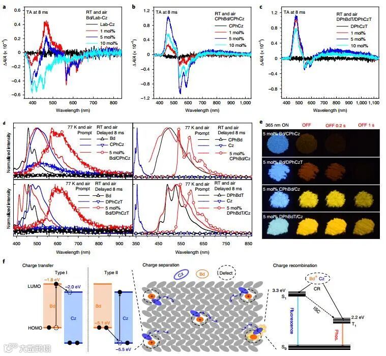 为了探索机理,作者从光激发后8 ms的记录中减去激发前记录的吸收光谱来获得瞬态吸收光谱,从而同步记录延迟发射和瞬态吸收光谱。在没有掺杂时,在光激发停止后仅显示了8 ms,表明在Lab-Cz、Lab-CPhCz和Lab-DPhCzT晶体中出现电荷分离状态,肉眼未观察到超长磷光。