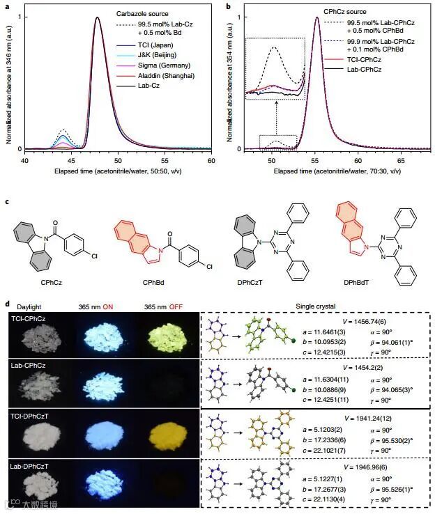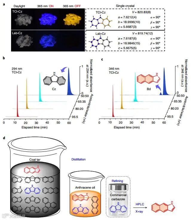 作者利用2-氨基联苯合成了高纯度的Cz(Lab-Cz)。在相同晶体状态下,Lab-Cz的荧光比TCI-Cz的荧光蓝移了54nm,并且超长磷光几乎消失。但是,Lab-Cz晶体的室温超长磷光不能用肉眼观察。利用高效液相色谱(HPLC)监测346 nm处的起始吸收,随着洗脱液比例的优化,出现杂质峰。而在294 nm处监测时,杂质的信号被主要Cz的最大吸收所覆盖。此外,作者利用X射线晶体学发现杂质的结构是Cz的异构体,即1H-苯并[f]吲哚(Bd)。异构体Bd在结晶状态下,不显示室温超长磷光。