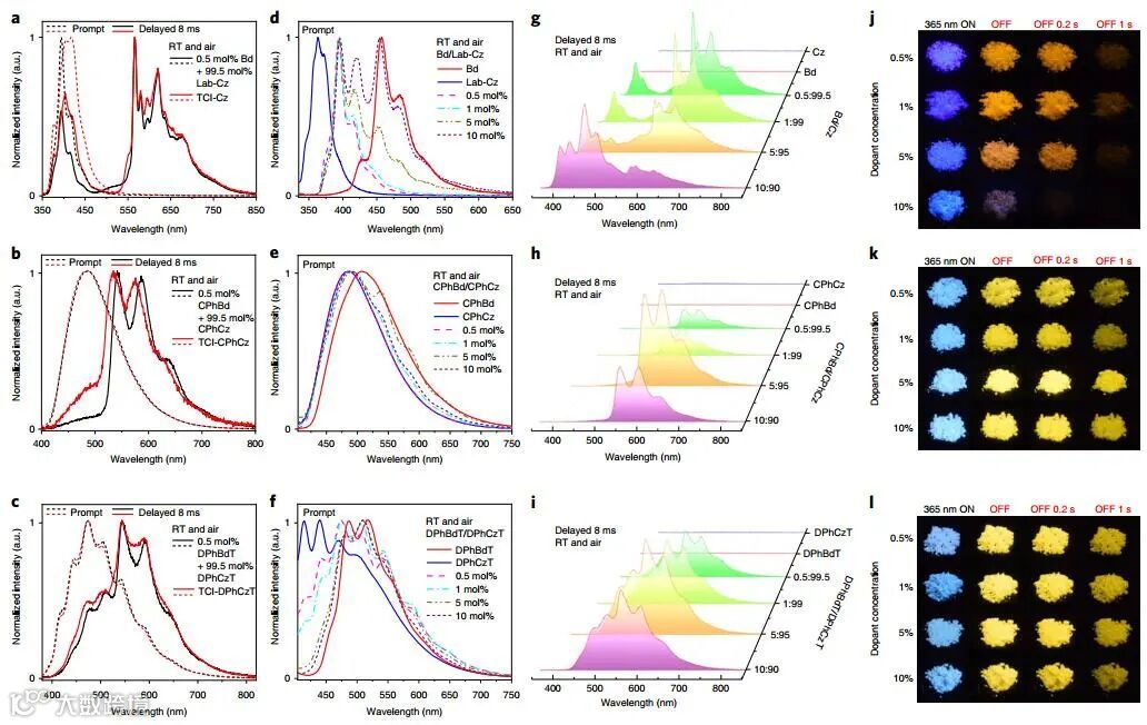 作者研究了0、0.5、1、5、10和100 mol%的晶体中Bd/Lab-Cz、CPhBd/CPhCz和DPhBdT/DPhCzT的发射特性,以了解同分异构体对超长磷光的影响。其中,每对0.5 mol% Bd/Lab-Cz和TCI-Cz、0.5 mol% CPhBd/CPhCz和TCI-CPhCz和0.5 mol% DPhBdT/DPhCzT和TCI-DPhCzT显示出几乎相同的瞬时和延迟光谱,证实了超长磷光的异构体掺杂效应。当用0.1 mol%异构体掺杂时,上述掺杂体系出现有效的室温超长磷光。对于快速发射,Bd/Lab-Cz、CPhBd/CPhCz和DPhBdT/DPhCzT的荧光随着掺杂剂含量的增加而红移,说明Lab-Cz可以促进深蓝色发光体的发展。同时,每对异构体的快速发射之间的明显差异表明,Cz和Bd具有完全不同的供电子能力。此外,高分辨率荧光表明发射来自局部激发(LE)态,而宽荧光是电荷转移(CT)发射。Bd/Lab-Cz的延迟LE发射,两个波段分别在364-543 nm和544-836 nm,延迟时间为8 ms。延迟成分的短波长带随掺杂剂浓度的变化而变化,表明Bd的荧光与延迟发射有关。长波长带在1 mol%掺杂时显示出最高的延迟发射强度。其中,CT到LE的交叉导致可忽略的CT延迟发射和明显的LE延迟发射。延迟发射特性表明同时产生了单重态和三重态激发态。