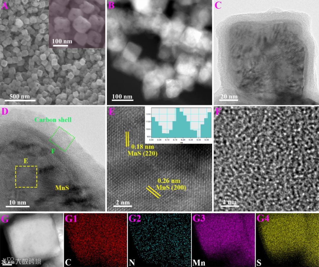 图1(A)MnS@NSC的SEM图像、(B-G)TEM和HRTEM图像和(G1-G4)MnS@NSC元素分布图像