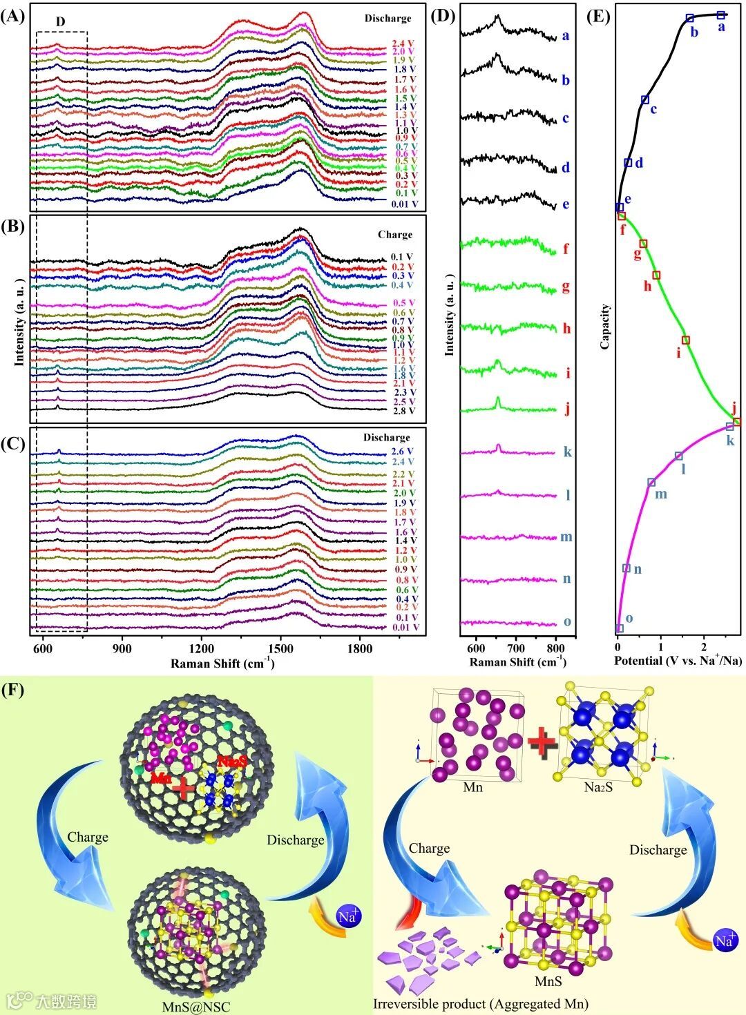 图2 (A–E) MnS@NSC充-放-充循环过程中的原位拉曼光谱图,(F) MnS@NSC 和MnS充分电机制比较示意图。