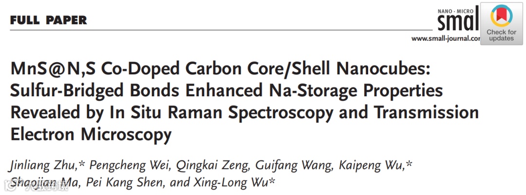 近日,广西大学的朱金良副教授,西南科技大学武开鹏博士和东北师范大学吴兴隆教授为共同通讯,朱金良副教授和韦鹏程硕士为共同一作在国际知名期刊Small(影响因子:11.459)上发表题为“MnS@N,S Co-Doped Carbon Core/Shell Nanocubes: Sulfur-Bridged Bonds Enhanced Na-Storage Properties Revealed by In Situ Raman Spectroscopy and Transmission Electron Microscopy”的文章。